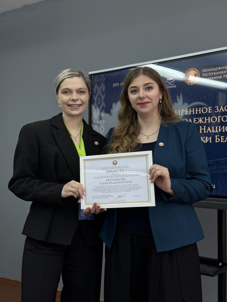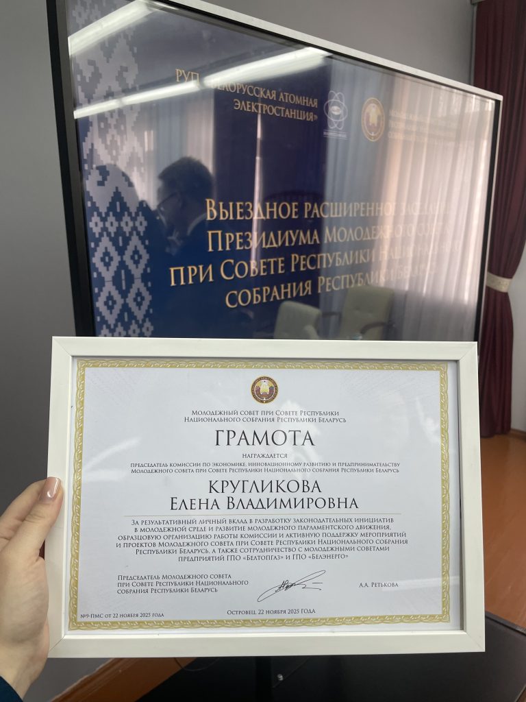 Елене Кругликовой вручена ГРАМОТА за результативный личный вклад в разработку законодательных инициатив в молодежной среде и развитие молодежного парламентского движения, образцовую организацию работы комиссии и активную поддержку мероприятий и проектов Молодежного совета при Совете Республики Национального собрания Республики Беларусь, а также сотрудничество с Молодежными советами предприятий ГПО «Белтопгаз» и ГПО «Белэнерго».