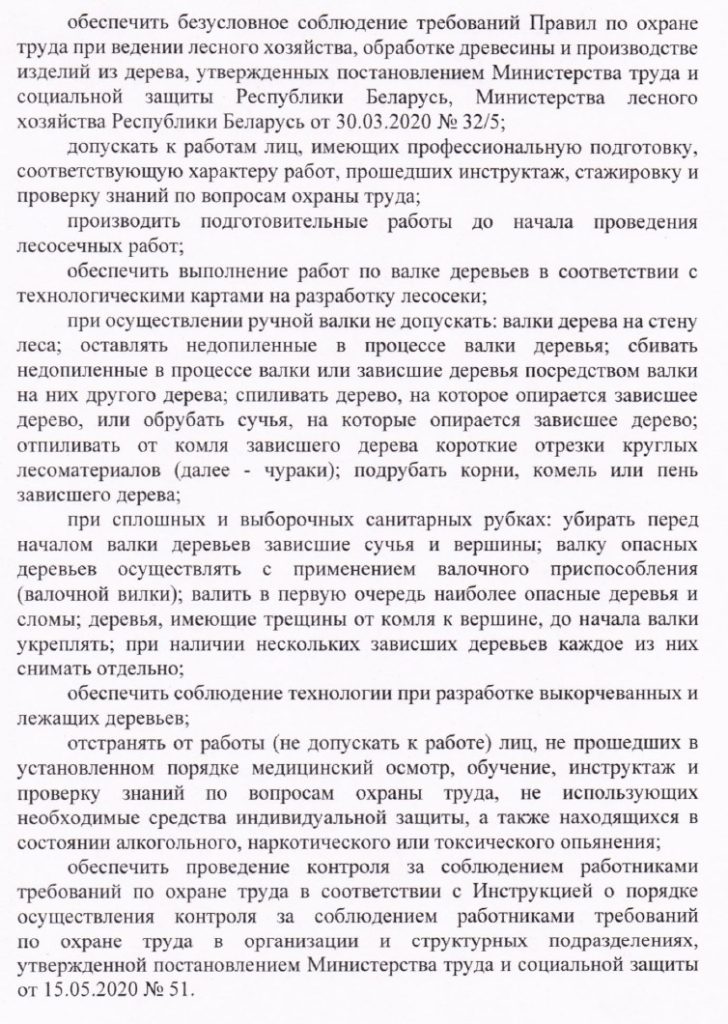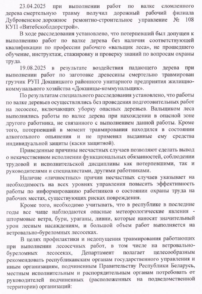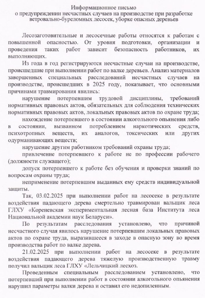 Информационное письмо о предупреждении несчастных случаев на производстве при разработке ветровально-буреломных лесосек, уборке опасных деревьев
